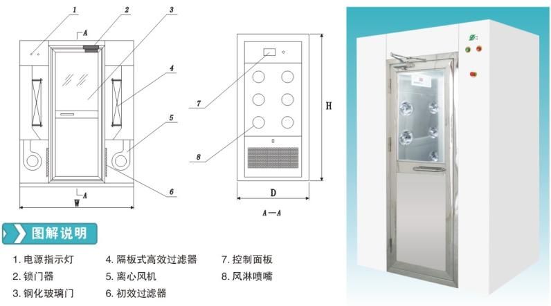 1. 風淋室由箱體、門、高效過濾器、初效空氣過濾器,送風機、配電箱、噴嘴等幾大部件組成。