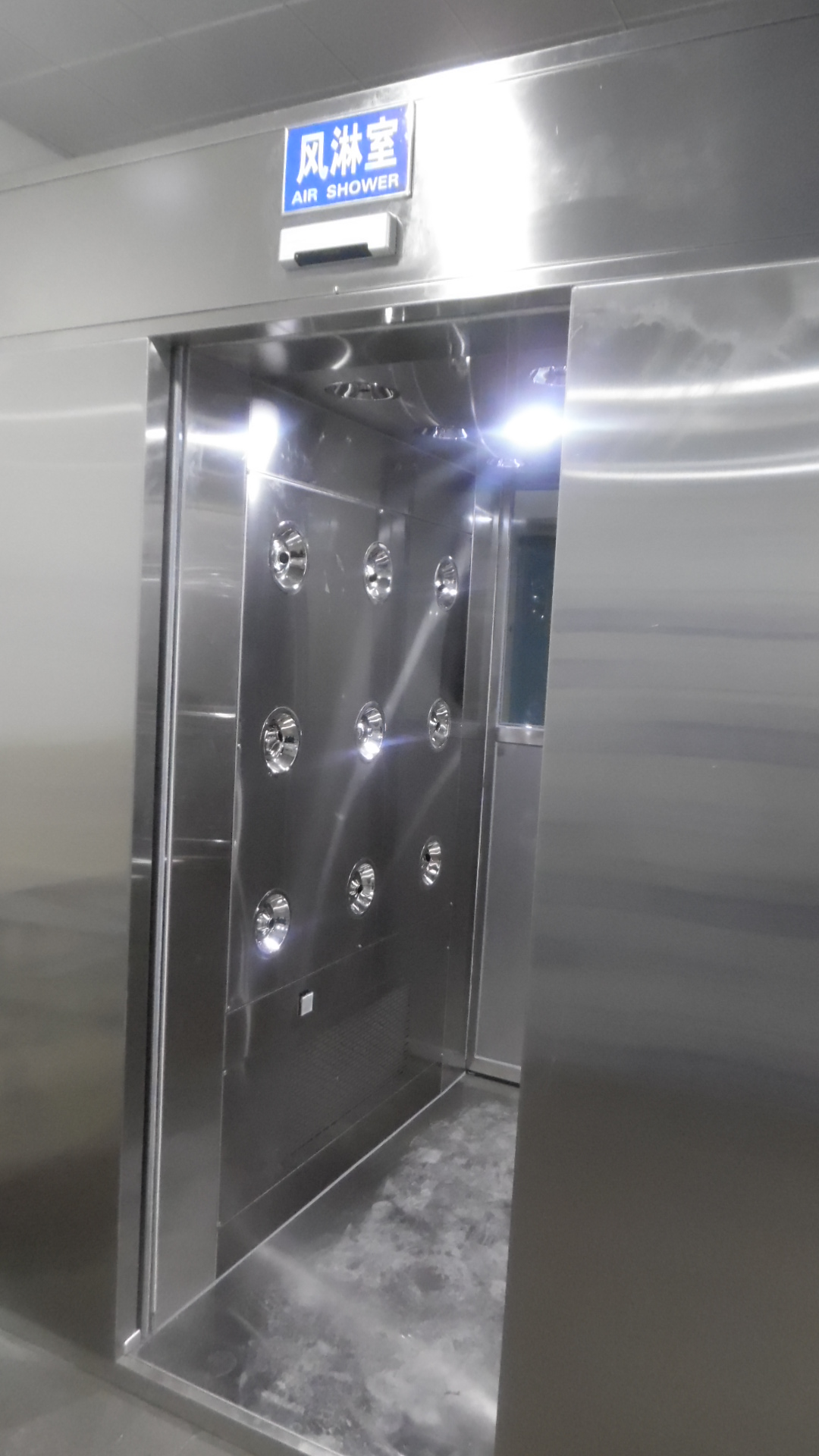 穿好防靜電潔凈服→打開前門,人員進入→風淋室開始吹淋,風速高達20m/s 以上,(風淋室:人在風淋區域中左右側身各數次,讓全身完全處于風淋中)此時電鎖工作,前后門都不能打開→風淋室經過10秒風淋后自動停止(風淋時間出廠時由廠家初始設定為10秒,也可由用戶自行設定)此時前門電鎖工作,人員不允許從前門退出→打開后門,人員/貨物出去→進門過程結束