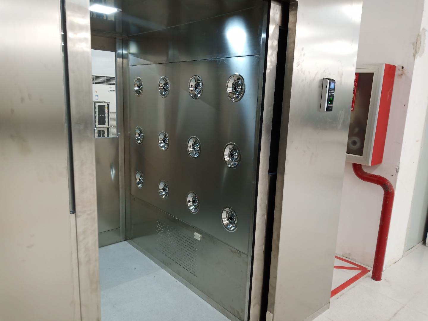 3、吹淋完畢:風淋室風機停止運作后二秒后才打開出門,離開風淋室。 在風淋過程中風淋室前后門皆處于鎖定狀態,內部人員不要強行開啟,以免損壞互鎖裝置及門鎖,若遇到緊急情況,請按下急停開關,風淋室將工作停止,此時進出門任意開啟通行。在待用閑置期間,風淋室進出門處于電子互鎖狀態。只能打開進出門的其中一面,請不要強行開啟。